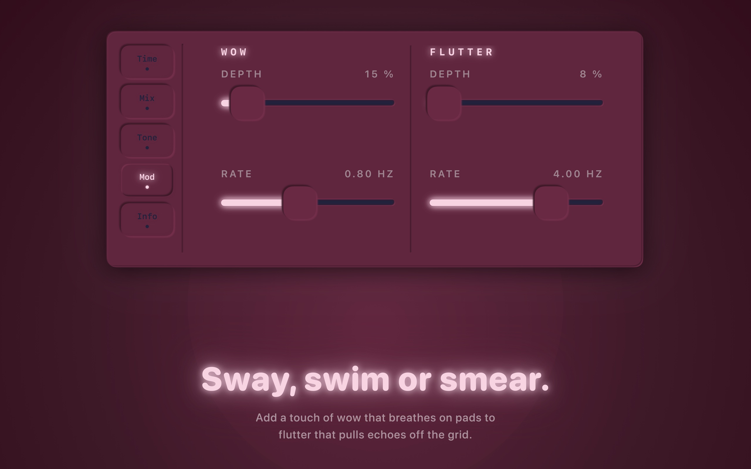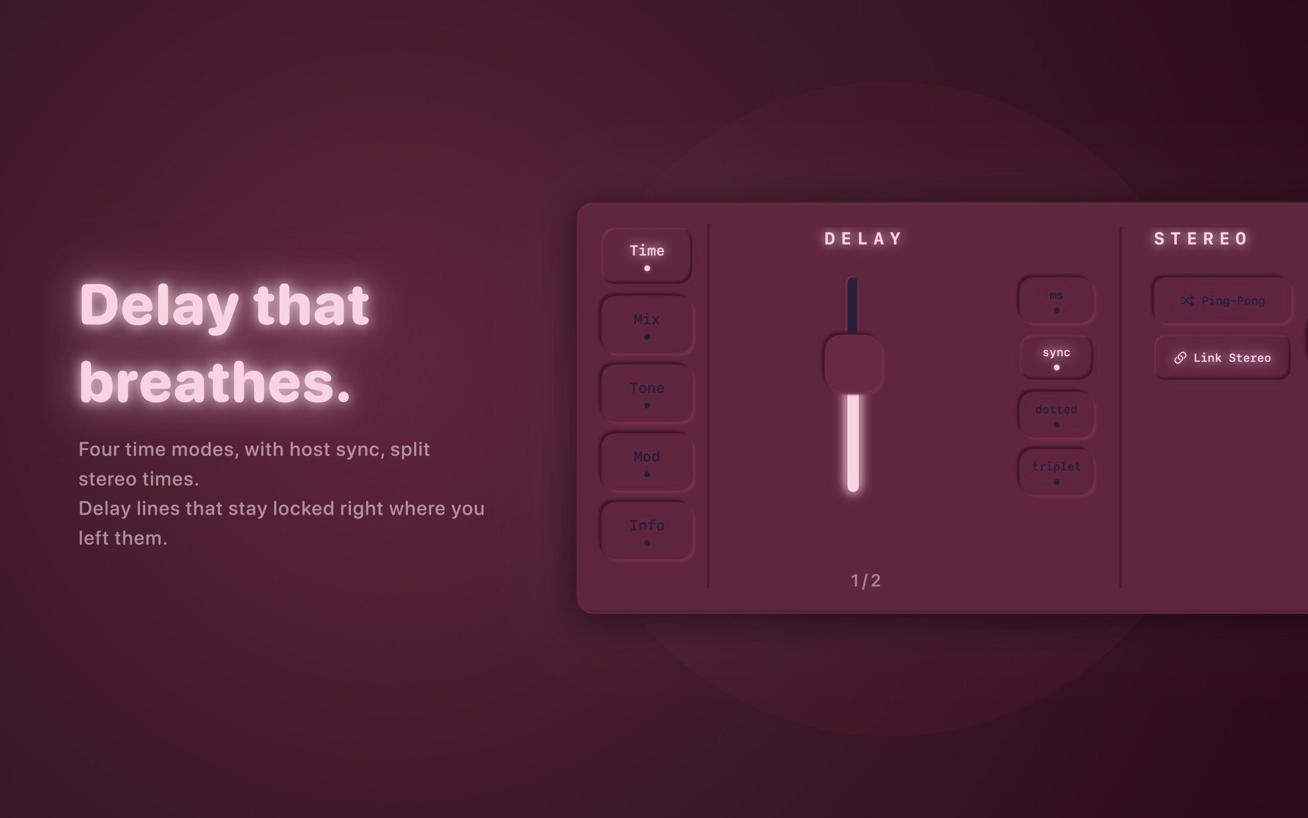 Independent L/R delay times, ping-pong mode, stereo width, and spread controls. From subtle widening to full stereo chaos.