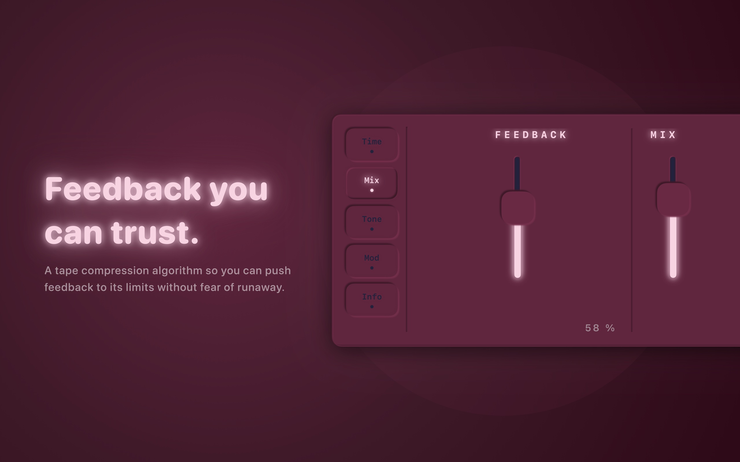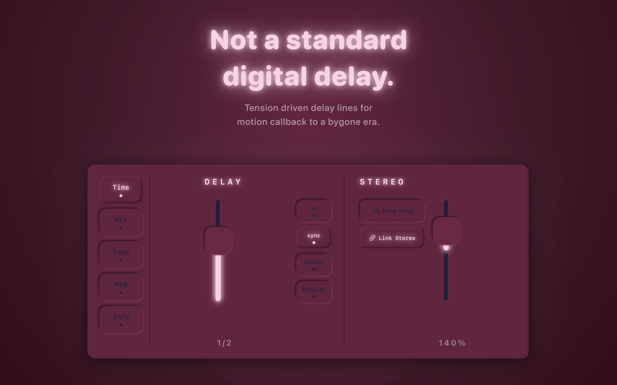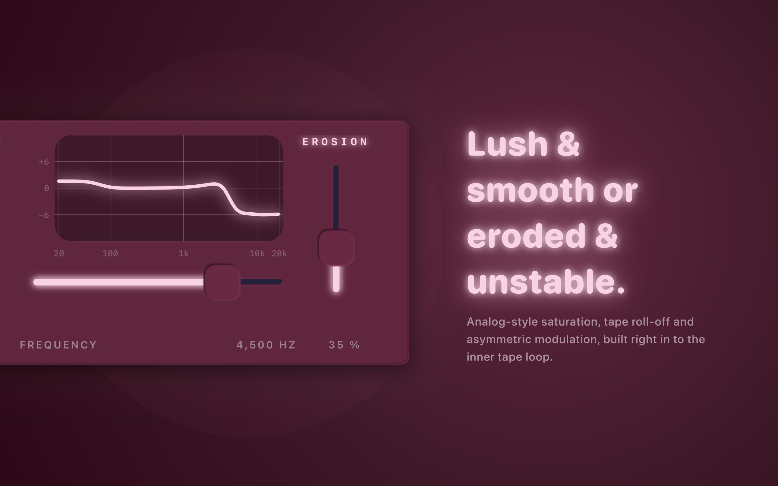 Stereo tape delay with analog-modelled wow, flutter, and tape head frequency response.